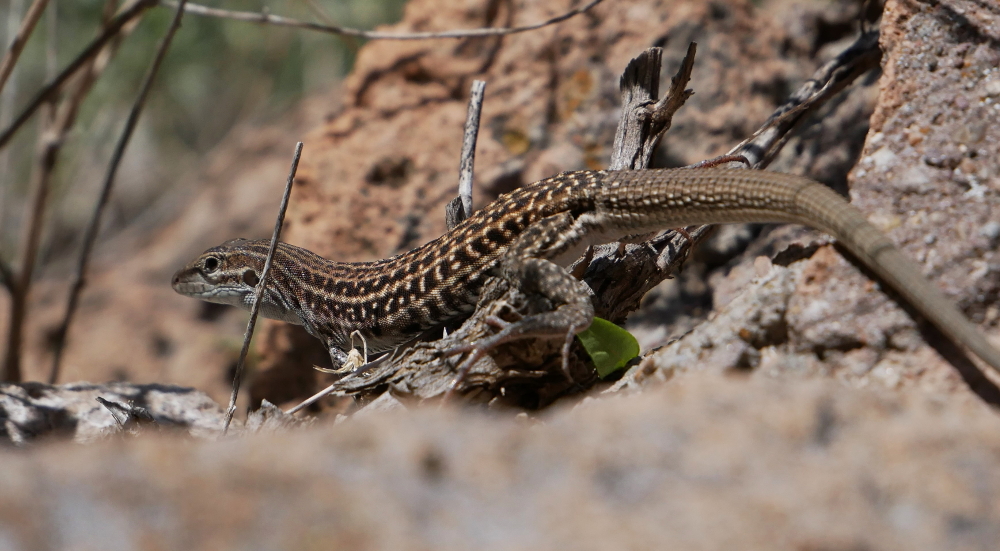 Jagged spires extend from the canyon wall like splayed feathers of a stone eagle. In tall vertical fissures, rock wrens perch and scan the land. Small lizards scurry about on and around gnarled rock formations while snakes slither in the grass below. This area's human inhabitants left long ago, but there's still plenty of life to be found here.