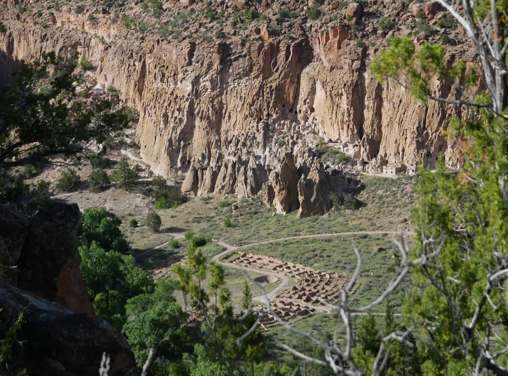 After being in the canyon all day, I wanted to get a different perspective and decided to climb up Frijoles Rim Trail. I hiked about an hour on the path and saw one couple. This trail provides tremendous views of the circular ruins of Tyuonyi and all the other archaeological sites along the Main Loop. The cavates among the tent rocks and rising pinnacles form a palatial scene. The clouds briefly parted and the sun lit up the canyon for about 10 minutes before its gray shroud returned.