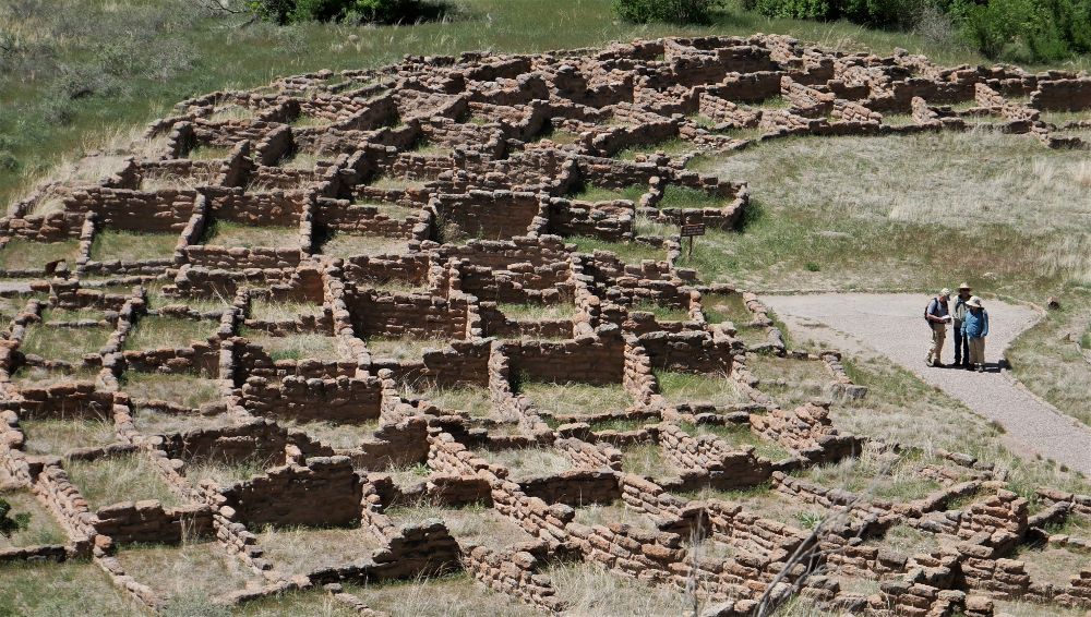 At the base of the canyon are the foundations of Big Kiva and the impressive Tyuonyi, a large circular pueblo built of stone blocks that once stood two to three stories tall and consisted of more than 400 compact rooms. The trail takes hikers through the ruins, the walls of which are only about six or seven stones high, and then up to a higher vantage point to allow for a better appreciation for Tyuonyi's size and shape. Nearby Talus House, fully reconstructed in the 1920s along the wall of the canyon, helps visitors envision how these structures appeared before they deteriorated.