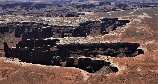 Gobsmacked by all I had already seen, Canyonlands presented me with a final confounding mystery before I continued my journey west. A road to the northwest section of Island in the Sky ends at a parking area below a bizarre landmark known as Upheaval Dome. A hike up to an overlook reveals something completely unexpected—a red-rimmed crater nearly three miles across filled with a whitish dome of older rock layers have been thrust up from below the newer layers.