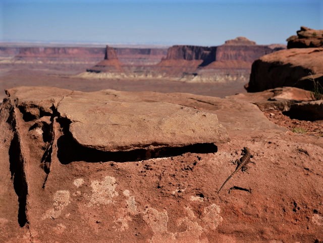 I stared at this view through the breathtaking frame of Mesa Arch just after a hoard of photographers shooting the sunrise scattered from the scene. I saw it again after hiking to Murphy Point, where wind gusts up to 35 miles per hour battered the fabric of a lone yellow tent weighed down by rocks just a few feet from a deathly drop. I saw it again over a lizard's shoulder while gazing out at Candlestick Tower. I saw it again at Grand View Point Overlook, where sandstone spires 300 feet tall look like toothpicks rising from the depths of Monument Basin. I saw it one last time at Green River Overlook, where down in the depths of the canyon a sliver of a snaking river slowly excavates more earth under the watchful eye of grand buttes and orange cliffs.