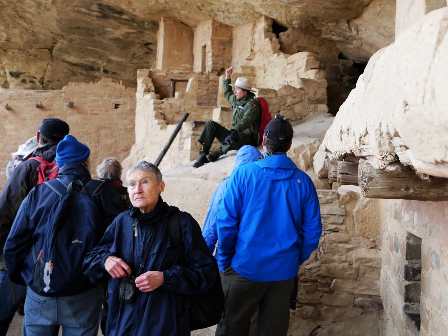 We started the hike by filing along a paved path and down metal stairways that were built in the 1930s until we were walking on a ledge 100 feet below the mesa top. We then climbed side by side up a wide 32-foot tall wooden ladder and squeezed through a tight, dark passageway that ushered us out among the ancient structures of the Balcony House alcove.